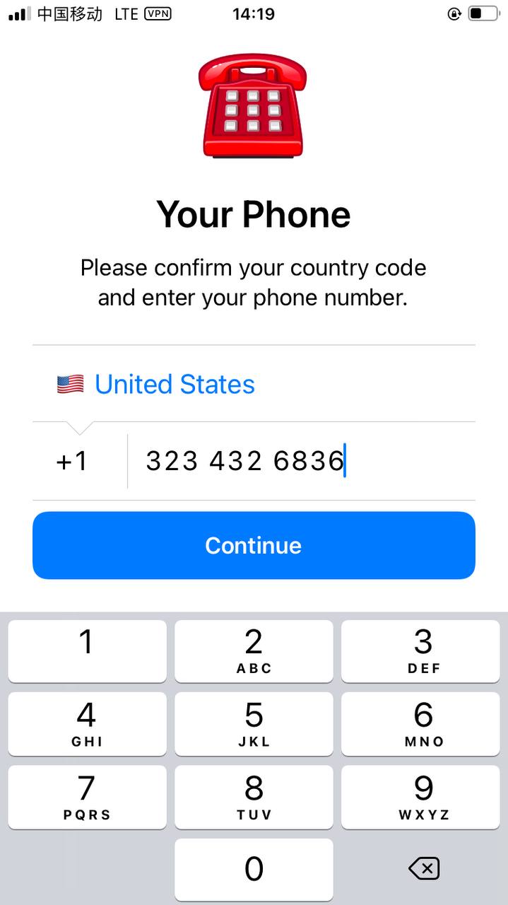 2、登录使用: 首先打开VPN然后打开app,选择国家代码(例如,+1),然后输入你购买的号码,如图